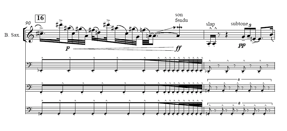[1] São exemplos de técnicas estendidas no sax : sons múltiplos (dois ou mais sons obtidos ao mesmo tempo), slaps (sons percussivos obtidos pelo golpe curto da língua e da coluna de ar na palheta), tong-ram (ágil golpe de língua na palheta ou no toldel, precedido de ar), sons percussivos de chaves, growl (uso da voz ao mesmo tempo que o sopro), sons eólios (sons de “vento”, podem ser produzidos com muitas variações, com ou sem a boquilha), respiração circular.