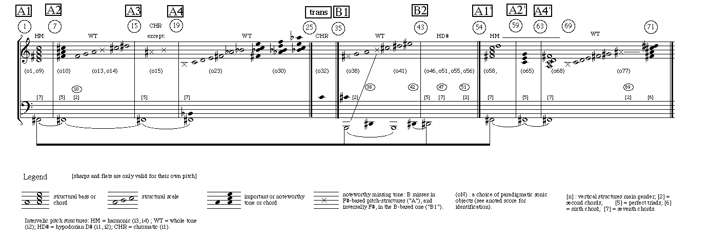 [fig. IV] Observamos então um princípio estrutural que contrapõe sistematicamente seções em tons inteiros (WT) com seções cromáticas (CHR), entre os compassos 7 e 42. Sob este ponto de vista, a única seção utilizando o modo hipodoriano de Ré# (HD#, c. 43-53), que conclui todo o episódio, pode ser interpretada como uma síntese, uma resolução equilibrada desta lógica opositiva binária [7]. A organização harmônica (HM), por sua vez, é exclusiva dos momentos liminares da obra, ou seja, da parte A da grande forma cíclica ABA, ou ainda, mais especificamente, da região sustentada pelo baixo Fá#. Esta organização dos cromas me parece configurar um vetor primordial da personalidade formal da obra, que se sobrepõe ao estatismo subjacente do nível remoto.