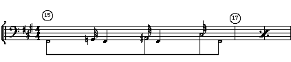 - c. 15-18, como infraestrutura implícita da melodia [fig. II]. Aqui, a movimentação cromática nas demais vozes (cf. a partitura) age eficientemente como elemento enfraquecedor [5].