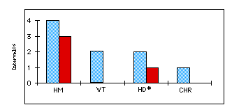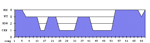 Estas organizações, vale a pena reparar, estão cuidadosamente escolhidas para evitar uma tonicização de Sí Maior. Classifiquei estas quatro categorias em ordem decrescente de intervalo estrutural e rotulei-as assim, nos gráficos e demais demonstrações a seguir [fig. III] : HM (para harmonic ) (i3 + i4) - WT (whole-tone) (i2) - HD# (hypodorian D#) (i1 + i2) - CHR (chromatic) (i1).