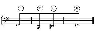 [8] Para o cálculo desta correlação, a seqüência dos baixos foi numerizada seguindo a convenção Fá# = 0, Sí = 1, Ré# = 2, e as quatro categorias de estruturação dos cromas, de 1 a 4, tal como no gráfico fig. 4. Levei também em conta a proporcionalidade de cada categoria, ou seja, o número de vezes que cada uma é utilizada, tal como consta na fig. 4. O coeficiente de correlação das duas listas é de (- 0.25), um valor significativo em termos absolutos. O signo negativo não é significativo no presente cálculo, pois é o resultado da progressão numérica crescente 0-1-2 adotada arbitrariamente para os baixos fundamentais (ela poderia ter sido decrescente 2-1-0 sem alterar a validade da evaluação). retorna